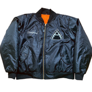 The water repellent jacket is made up of a nylon exterior with 100% polyester insulation. There are 5 pockets, a ribbed-knit collar and waist band, an orange liner interior and brass zippers.
